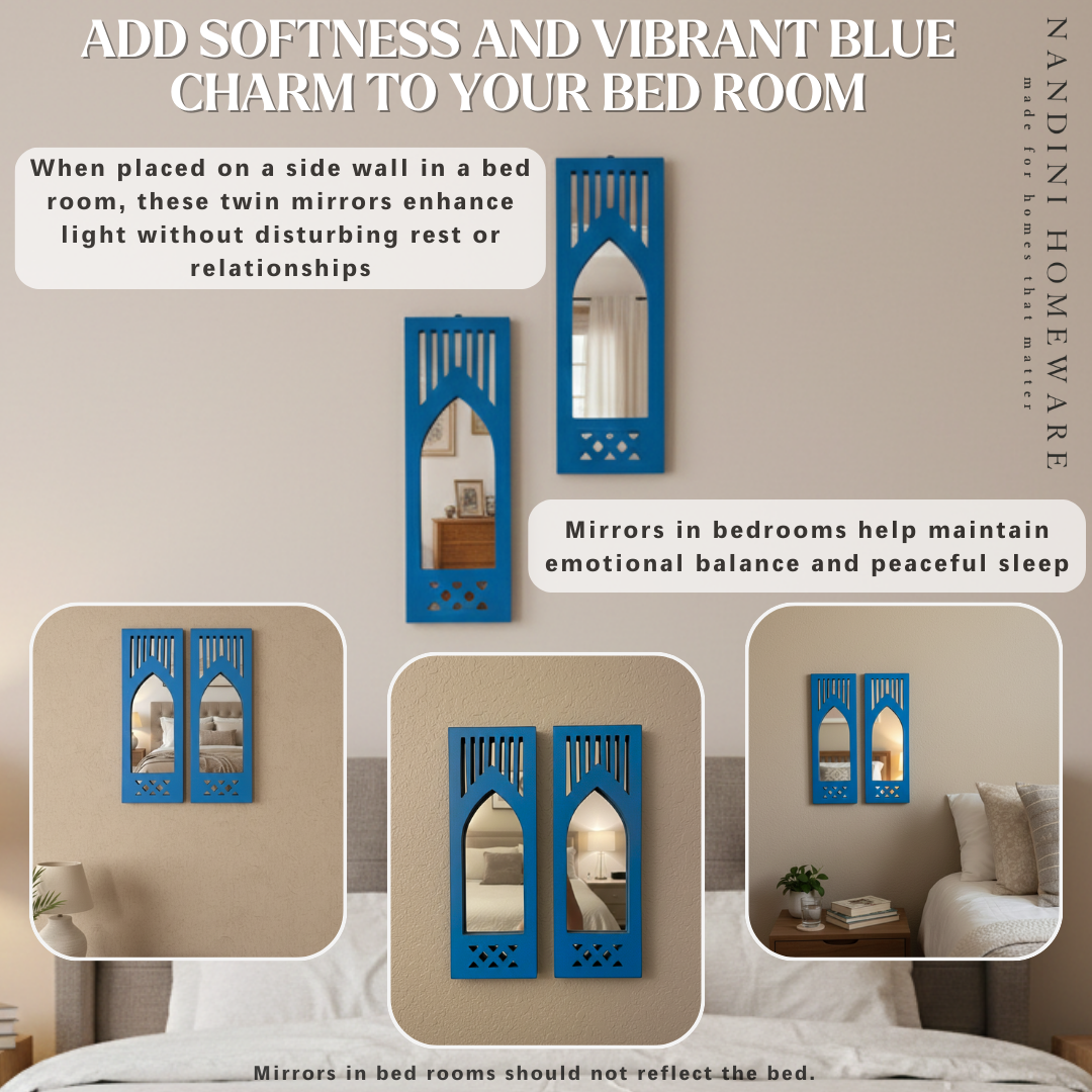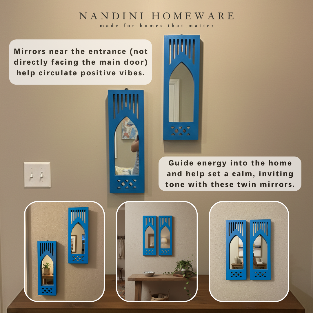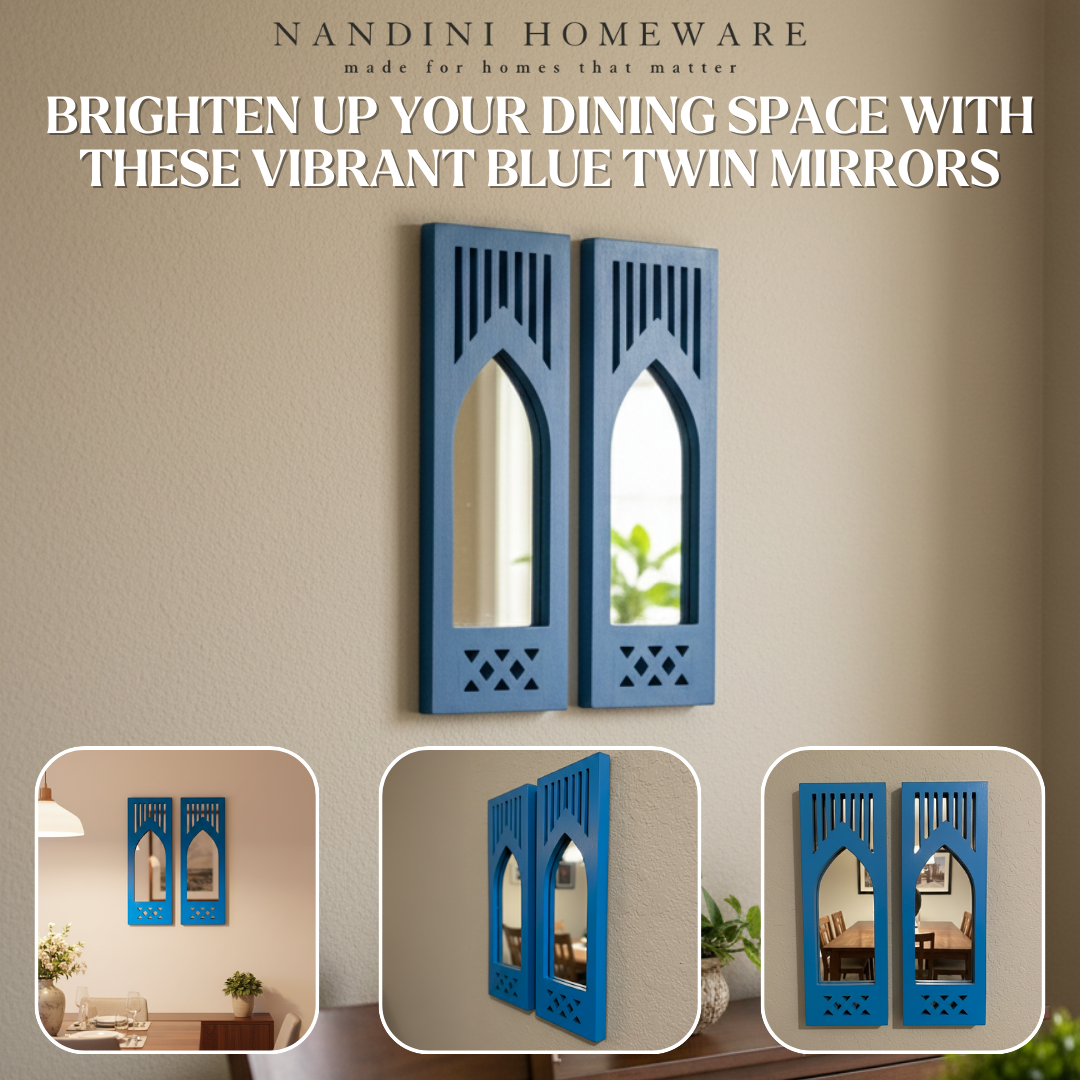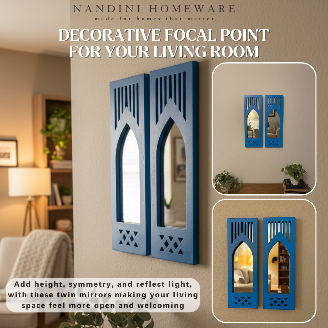 The Blue Modern Set of 2 Jharokha with Mirror showcases exquisite wooden craftsmanship inspired by Modern architecture. Its elegant blue finish highlights delicate carvings, creating a refined decorative piece that enhances any interior space. This wooden jharokha not only serves as a functional mirror but also brings heritage charm and artisanal detail to your décor, making it an ideal addition for those seeking both beauty and tradition.