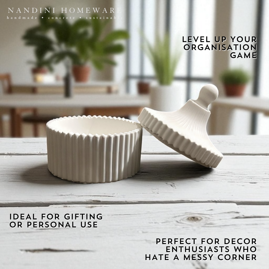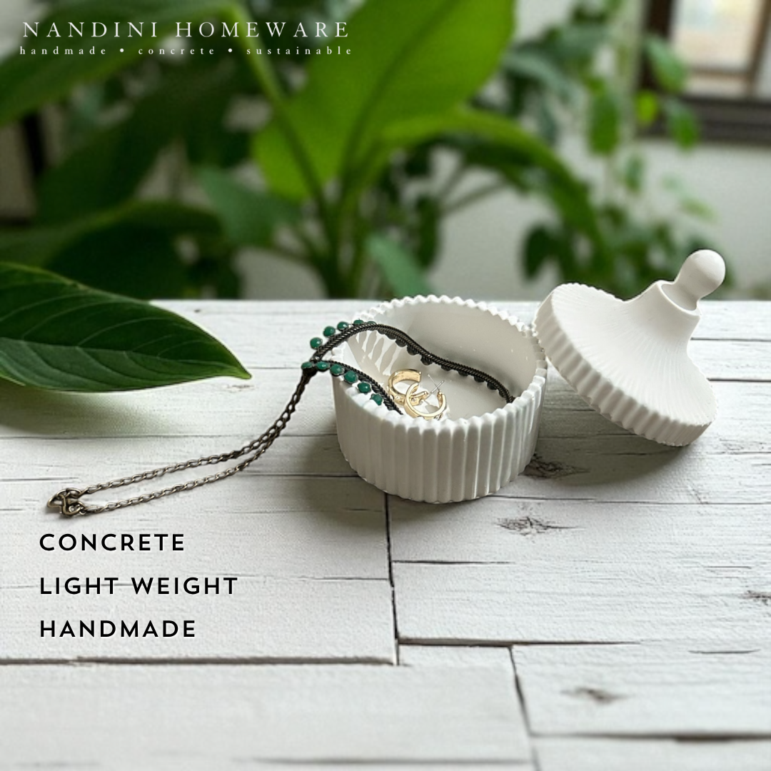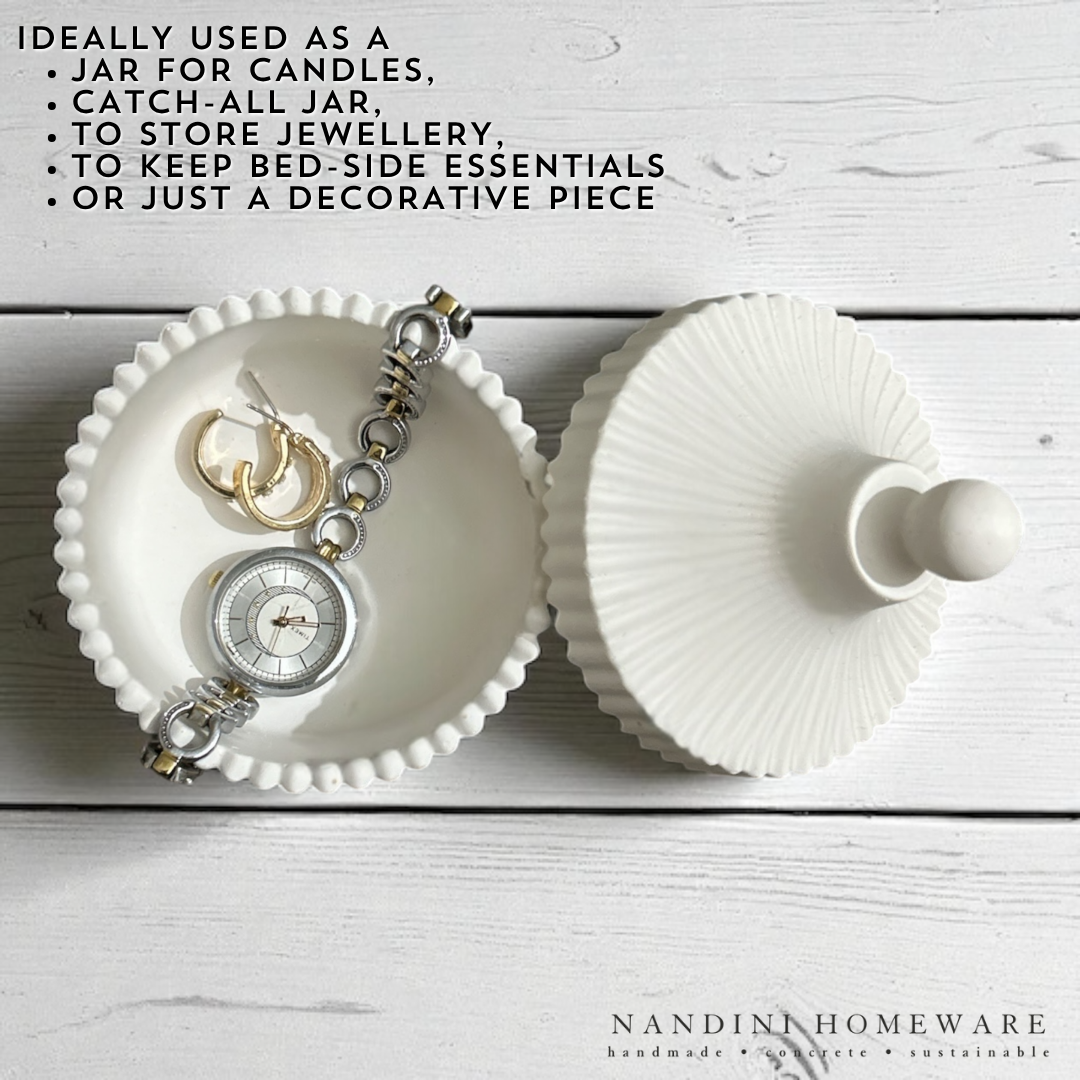 Material: Nandini Homeware jars are handcrafted from durable concrete, offering a unique texture and pattern that adds an artisanal charm to your home decor. Their sturdy build ensures long-term use while adding a subtle touch of elegance.