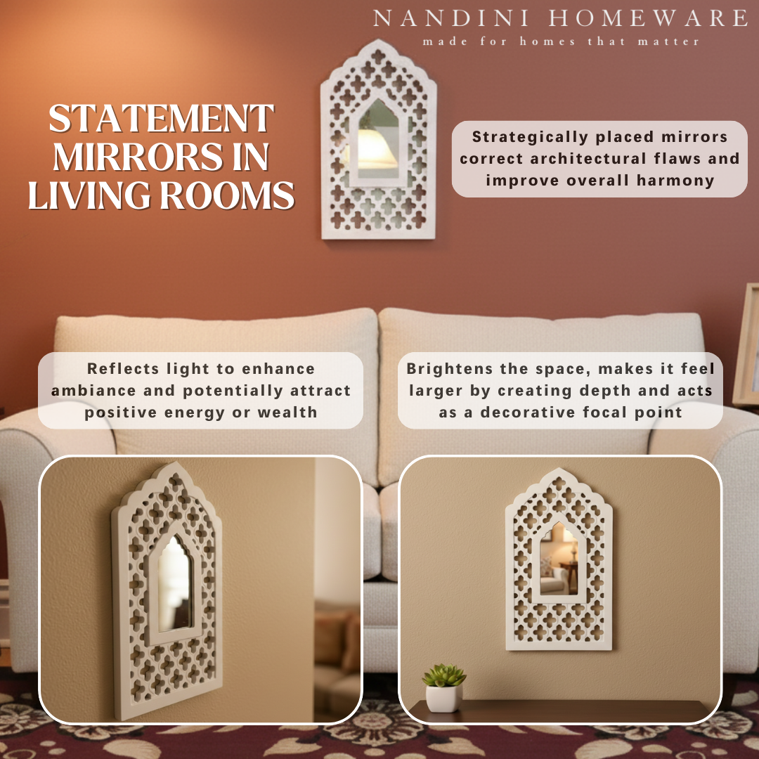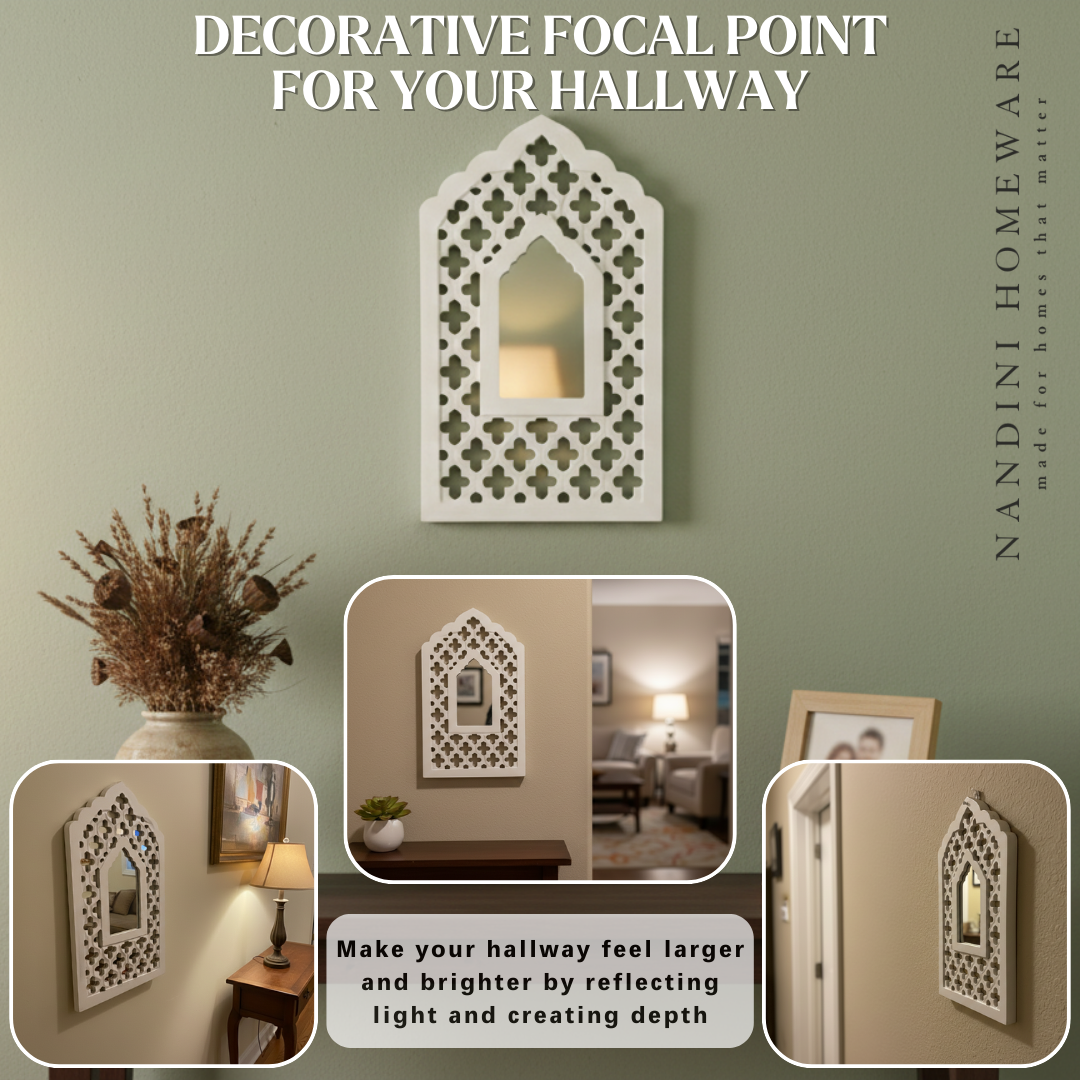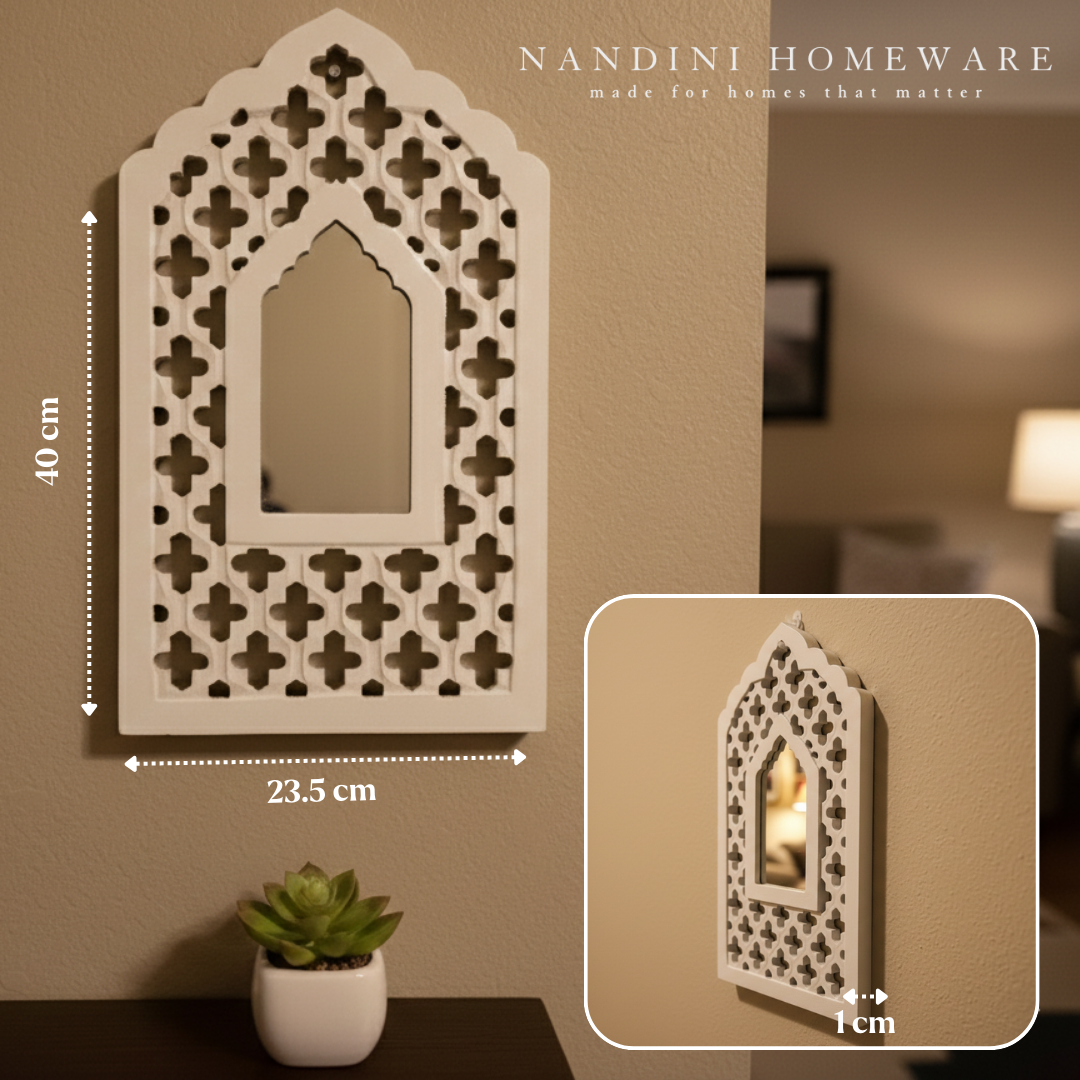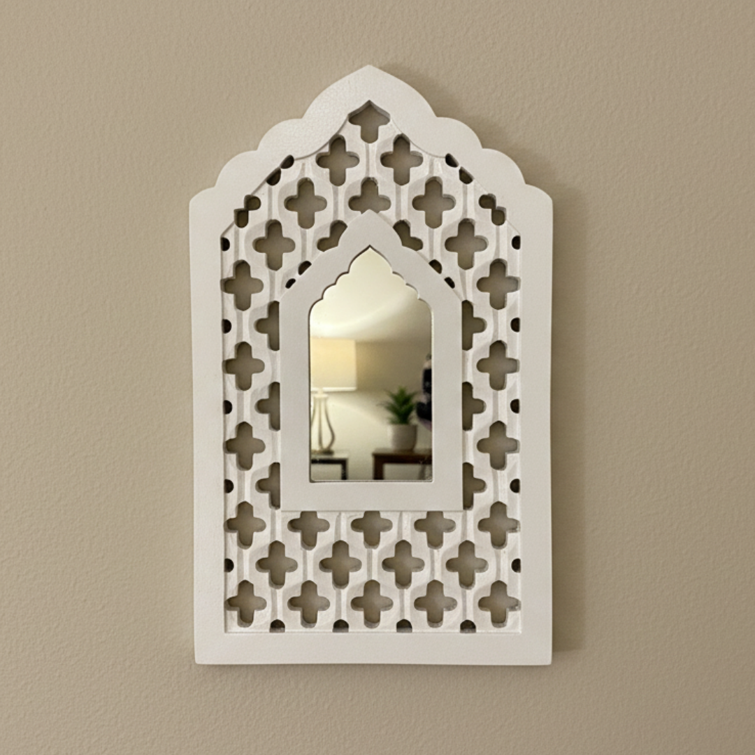 The White Mughal Jharokha with Mirror showcases exquisite wooden craftsmanship inspired by Mughal architecture. Its elegant white finish highlights delicate carvings, creating a refined decorative piece that enhances any interior space. This wooden jharokha not only serves as a functional mirror but also brings heritage charm and artisanal detail to your décor, making it an ideal addition for those seeking both beauty and tradition.