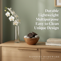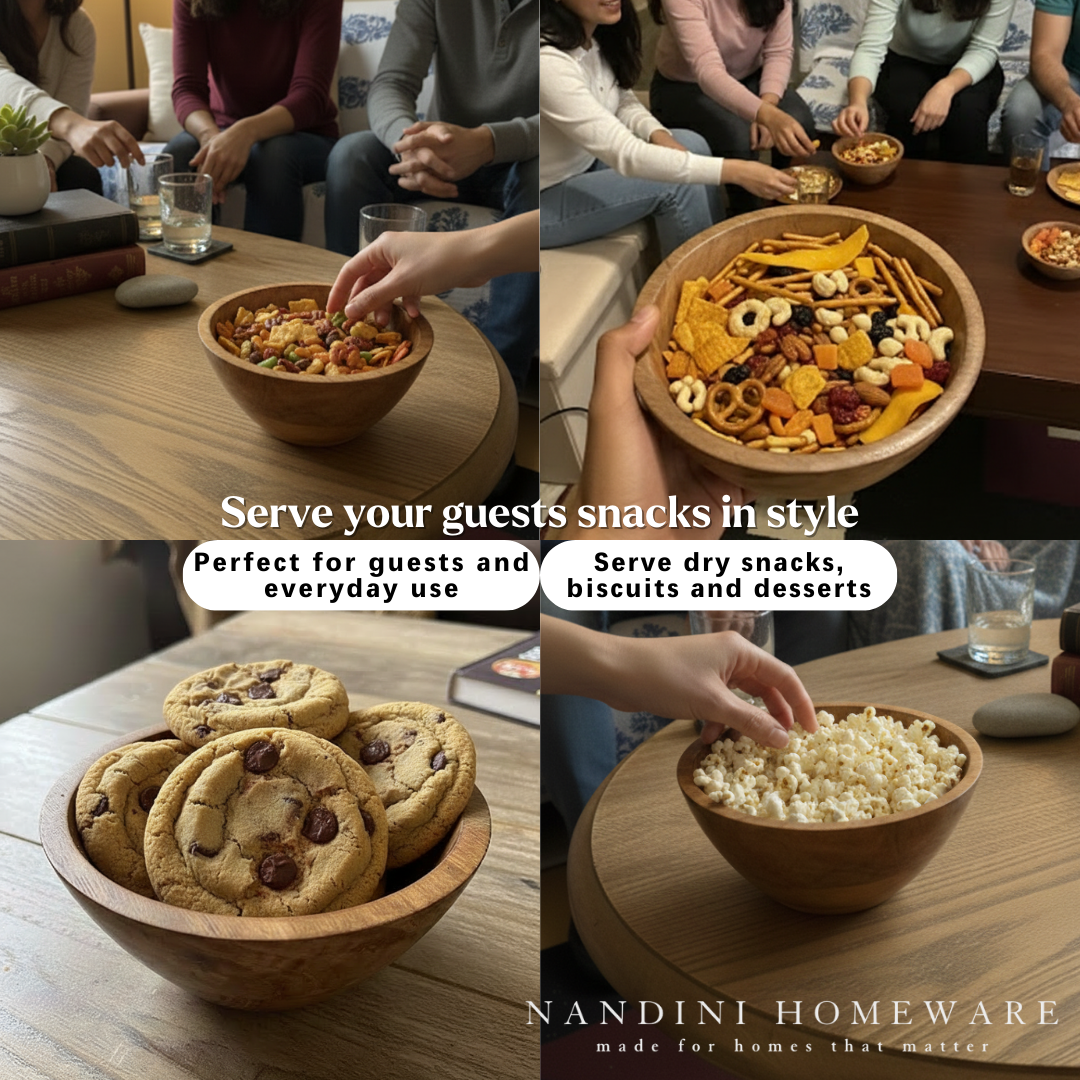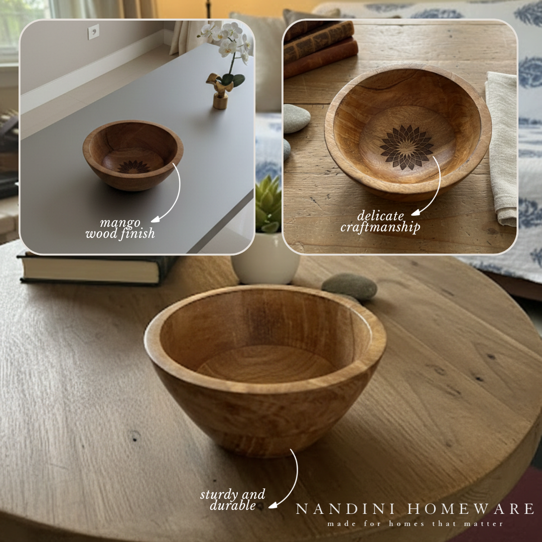 Handcrafted from sustainable mango wood, this serving bowl showcases intricate floral carvings that add artisanal charm to any space. Its versatile design makes it equally suited for tabletop display or practical use—serve dry snacks, nuts, or fruits with understated elegance. The natural wood grain and detailed pattern create visual interest while the sturdy construction ensures lasting durability. A thoughtful addition to contemporary or traditional home décor.